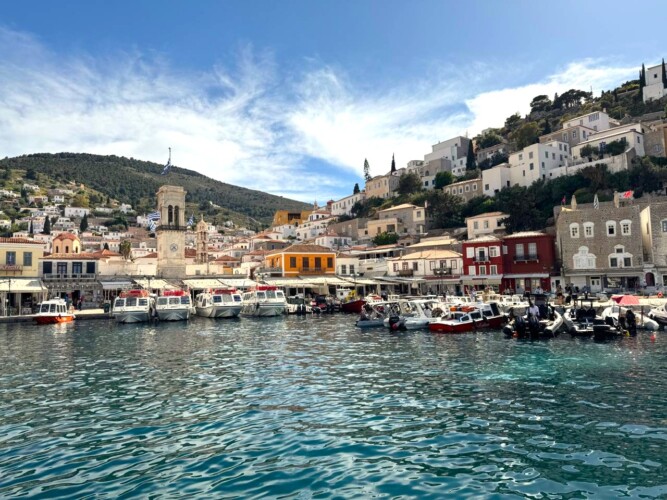 Spetses Island: Hydra has a crescent-shaped harbor, around which is centered a strand of restaurants, shops, markets, and galleries. Steep stone streets lead up and outward from the harbor area. Most of the local residences, as well as the hostelries on the island, are located on these streets. Wheeled vehicles are not permitted on the island, including but not limited to cars, motorcycles, scooters, bicycles, and e-bikes. Hydra, is an island of timeless beauty, it is renowned for its preserved architecture and car-free streets.